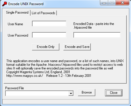 Описание: Программа для создания хеш файлов используемые в UNIX операционных системах для веб-сервера Апаче. Созданные файлы используются для ограничения доступа к отдельным папка веб-сервера при помощи .htaccess.![]() Версия: Encode UNIX password 1.2 Операционная система: Windows XP/ 7 / 8 Язык интерфейса: Английский Домашняя страница: http://www.magsys.co.uk/apps/ Размер: 0,3 Мб Ключевые слова (разделяются пробелом): htpasswd, htaccess, Пароль Автор: Ruterk 24 декабря 2013, 10:41:54 Рейтинг: У данного файла пока нет оценок. |